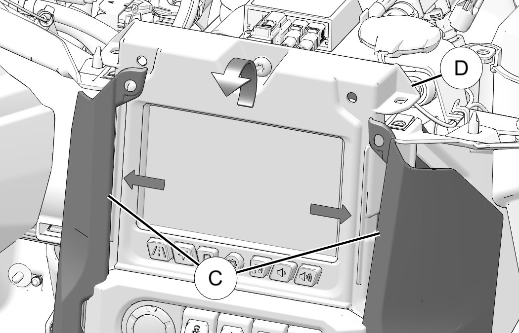 Carefully bend top of trim panel C sides outward. Lift and tilt center console frame D rear ward.