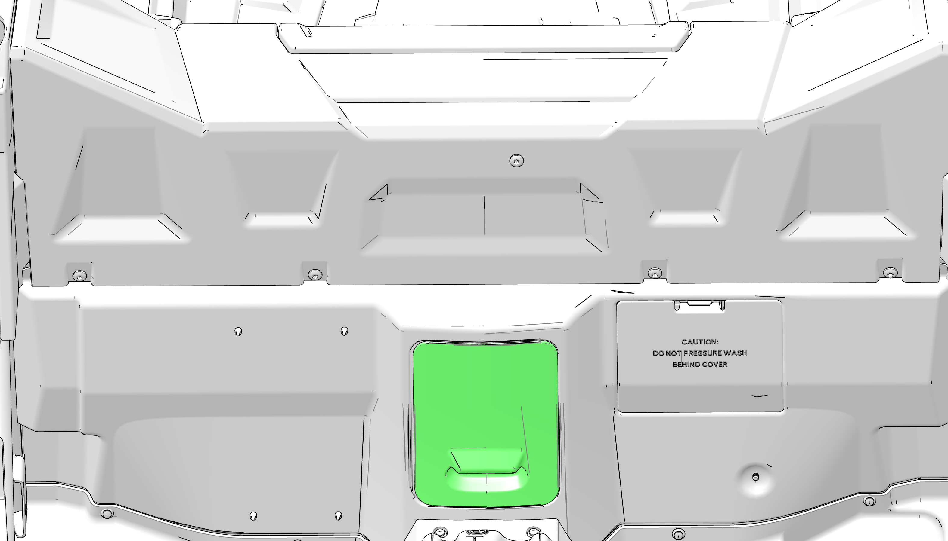 The cargo box access panel is located on the floor of the cargo box. Remove the panel to access the engine oil fill cap, spark plugs and air filter.
