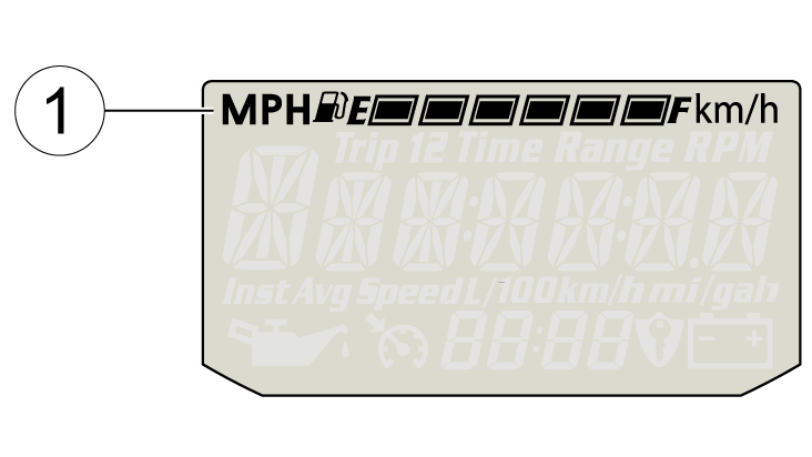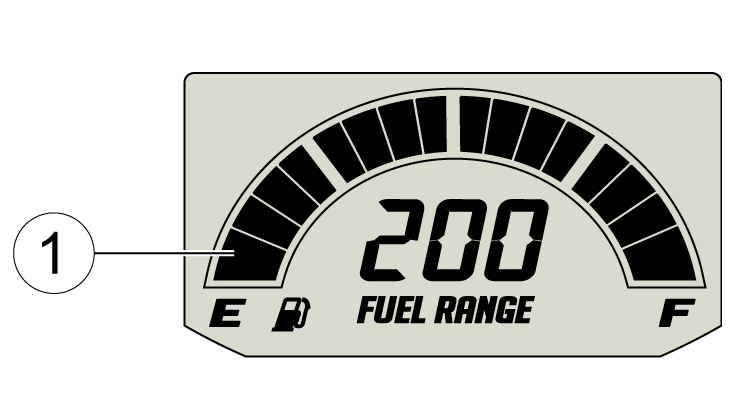 The segments of the fuel gauge 1 show the level of fuel in the fuel tank. When the last segment clears, a low fuel warning is activated. All segments including the fuel icon will flash. Refuel promptly.