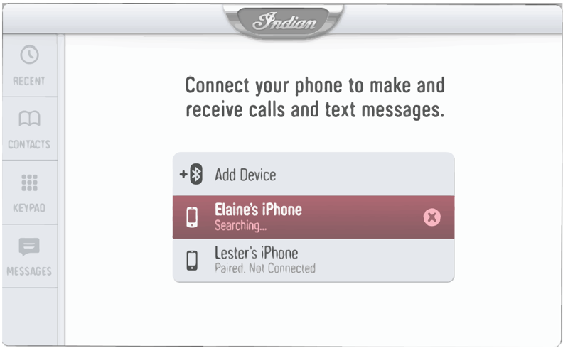 The Phone screen displays recent calls, contact list, key pad, and messages. The display will only show messages received while smartphone is paired via Bluetooth®. |