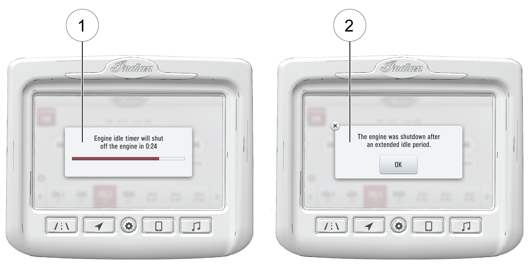 For motorcycles equipped with Ride Command, a notification will display a countdown timer to warn that the engine is about to shut off 1. After the time has elapsed and the engine is shut off, a subsequent notification will be displayed 2. After the engine shuts off, the engine can re-started by pressing the starter switch.