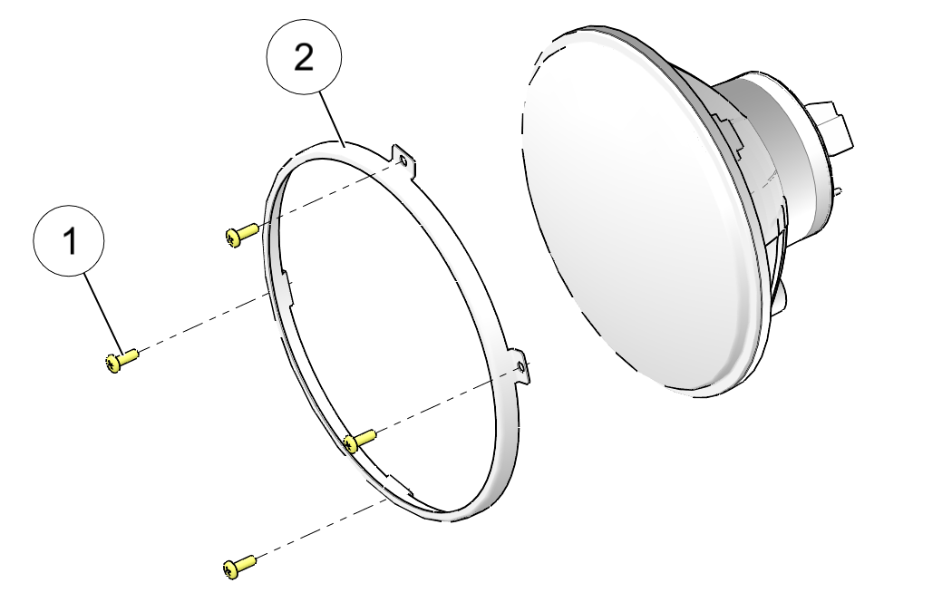 Remove the four screws 1 securing the headlamp retaining ring 2. Remove the retaining ring.