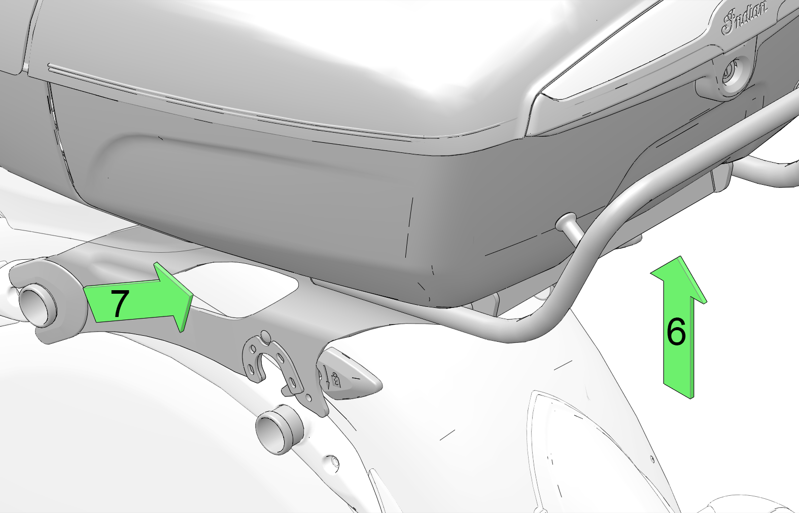 Lift up on the rear of the trunk 6 and slide rearward 7 to release the trunk from the motorcycle.