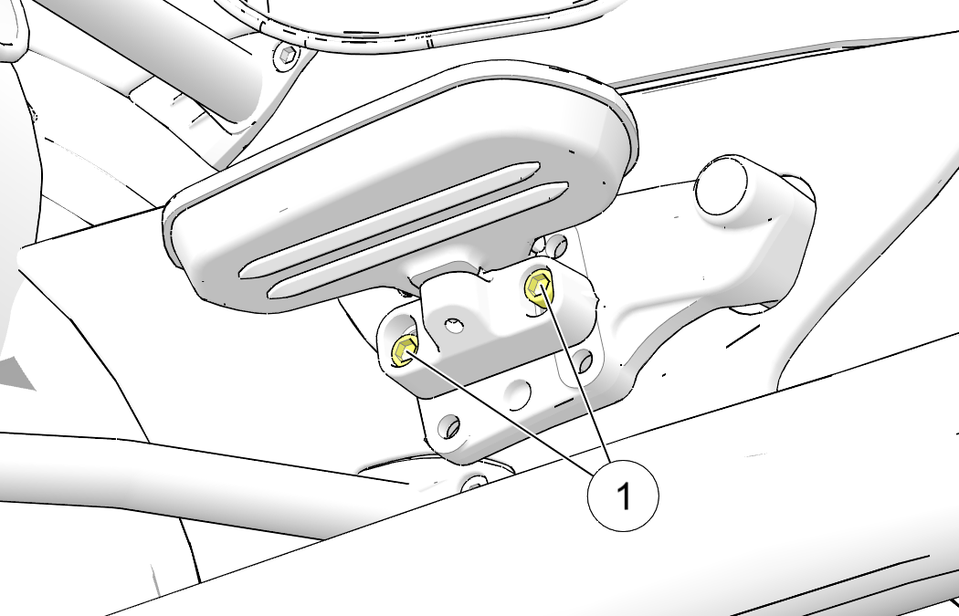To adjust the angle, loosen both attachment screws 1. Rotate the floorboard to the desired position using the indicator mark on the rear-facing support as a guide, then tighten the screws.