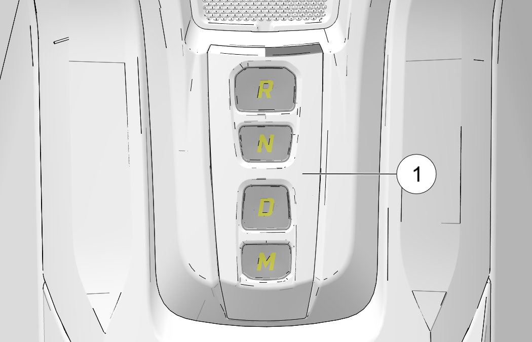 The gear selector 1 is located in the center console. To change gears, stop the vehicle and, with the engine idling and the brake pedal pressed, press the button corresponding to the desired gear. Do not attempt to shift gears with engine speed above idle or while the vehicle is moving.