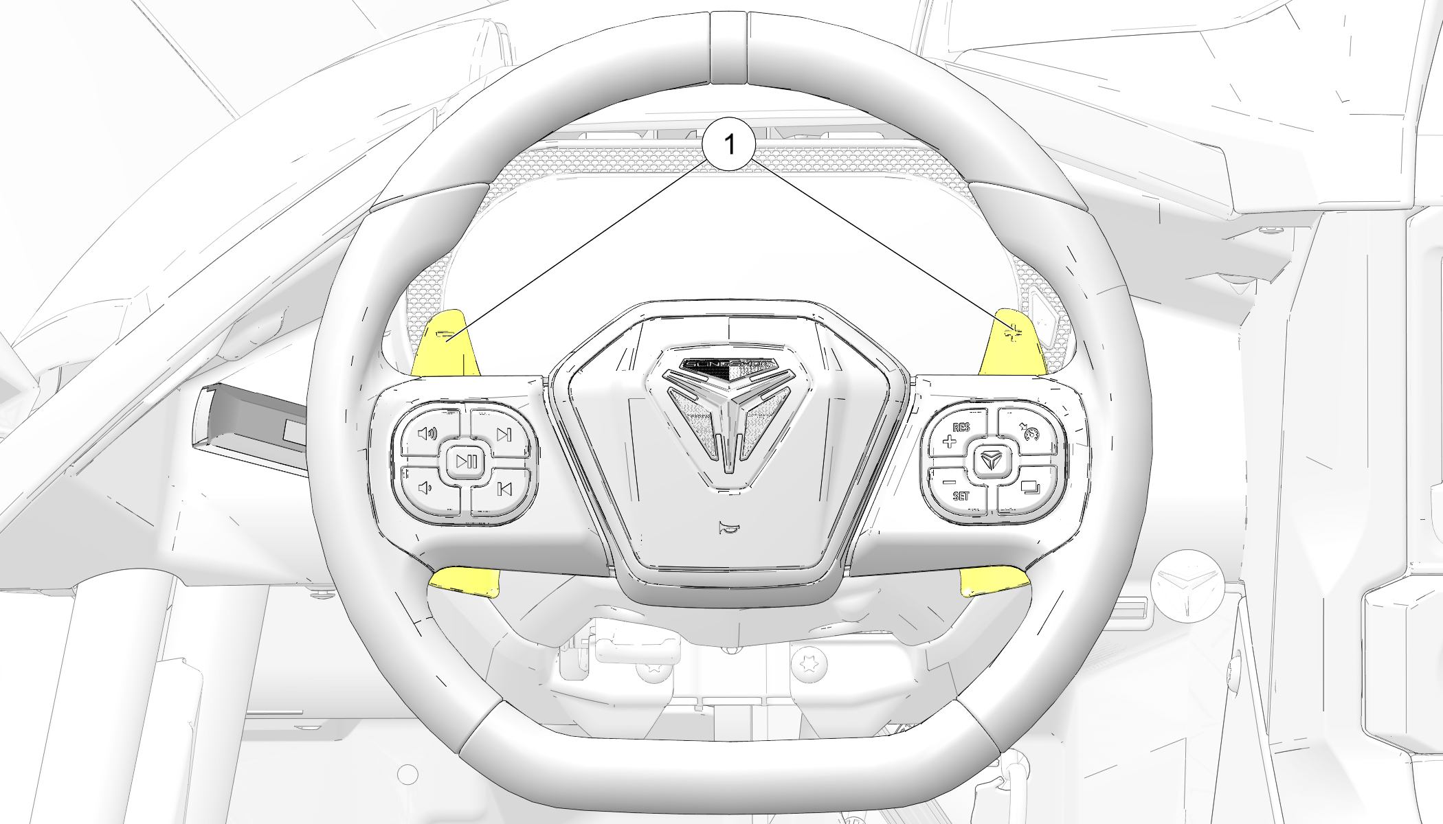 Paddle shifters allow manual control of forward gear changes with the AutoDrive transmission. While in manual control mode, the transmission will remain in the selected gear indicated on the rider information center even if the engine is approaching the high RPM limit. The transmission will automatically downshift to prevent engine stall.