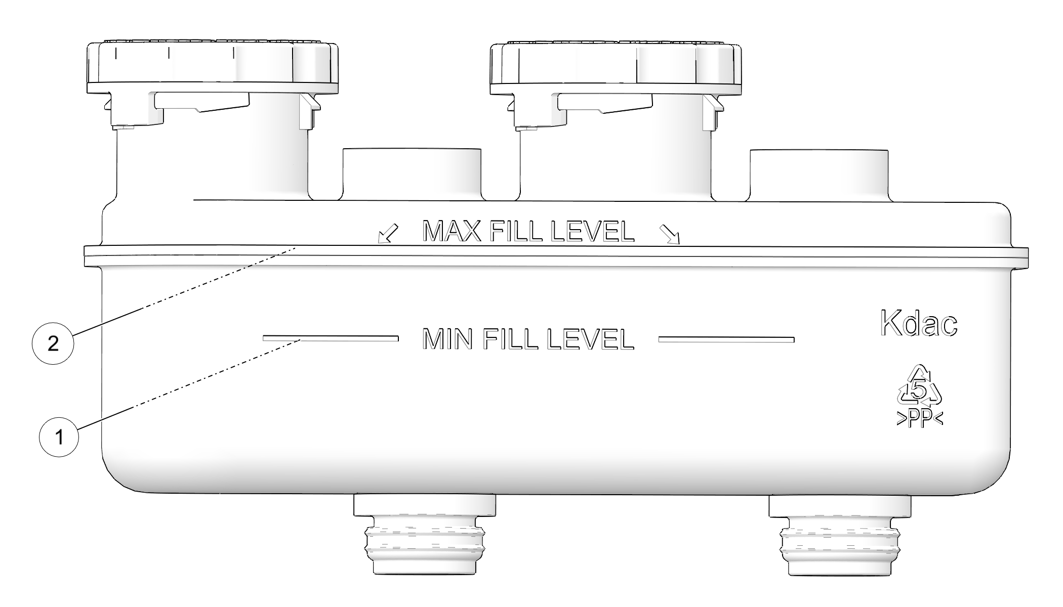 View the fluid level in the reservoir. If the fluid level is below the MIN 1 line on the reservoir, remove the cap and add the recommended fluid to the MAX 2 line. Do not overfill.