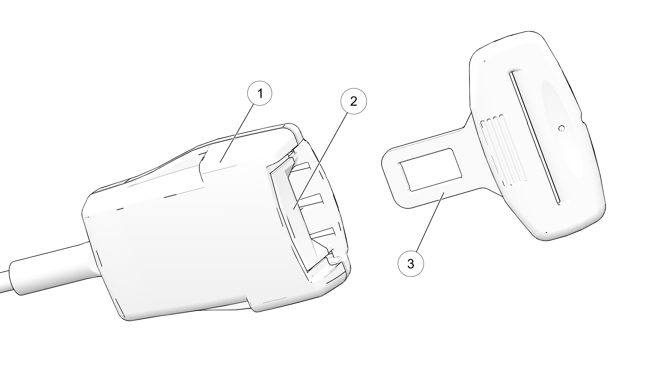 To release the seat belt, press the square red button 2 at the center of the latch housing.