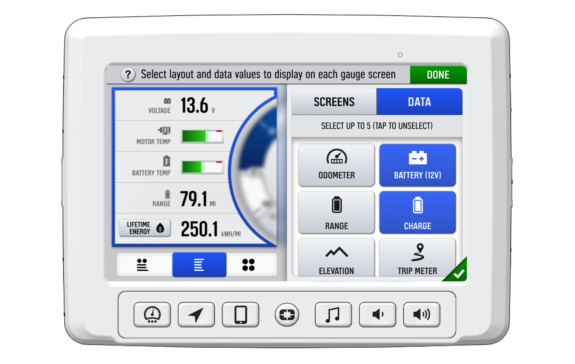 Press the Gauge Screen button to toggle between gauge screens. The display comes loaded with two different gauge screens. Additional gauge screens can be added or deleted.