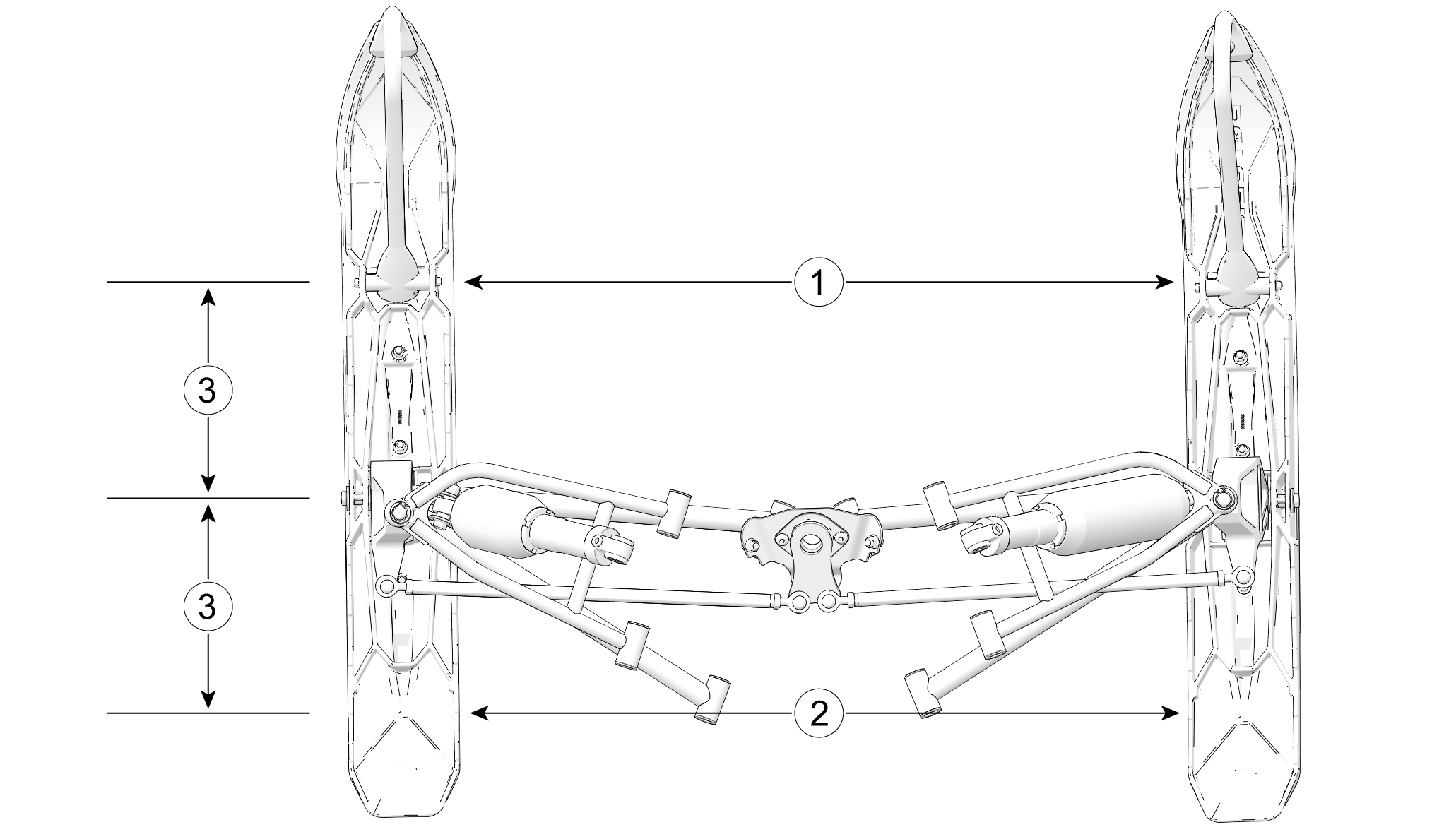 With only vehicle weight compressing the suspension, measure 10 inches (25.4 cm) forward from the center of the ski mounting bolt (see 3 in illustration below). At this point, measure between the skis. This is measurement 1.