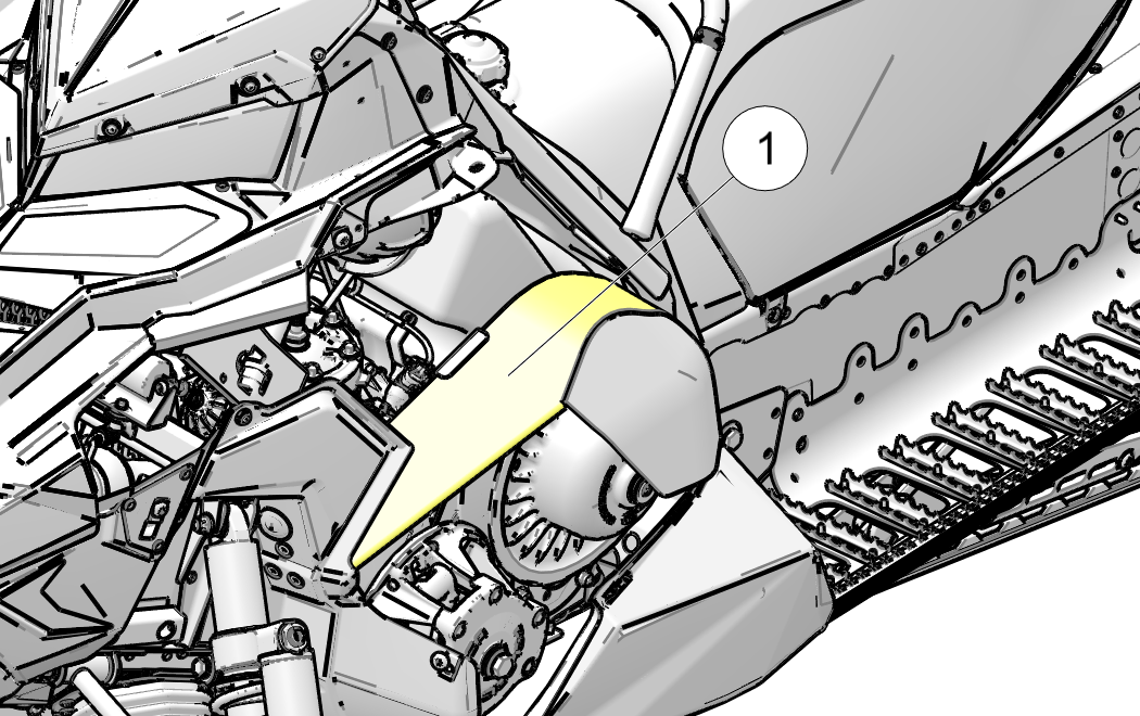 The Engine and Clutch Warning label 1 is located under the engine side panel on the belt guard.