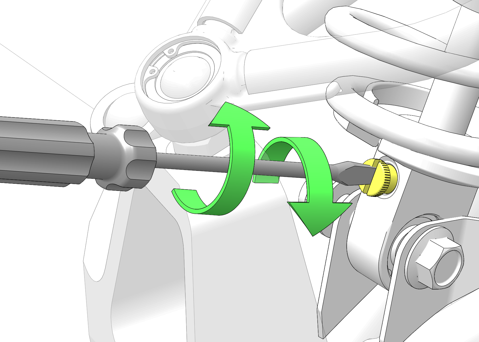 Increase the rebound damping force by turning the adjuster clockwise to increase the stiffness. Decrease the rebound damping force by turning the adjuster counter-clockwise to increase the softness. The maximum adjustment for this adjuster is the fully turned in position. The minimum adjustment is 16 clicks out from the maximum position.