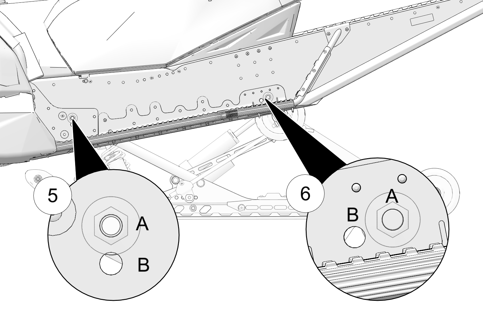Your vehicle is equipped with optional rear suspension mounting holes. The factory installed and preferred setting is the A position. If a drastic reduction in ski pressure is desired, you can move the labeled geometry points to the B position. The 6 adjustable points are as follows: