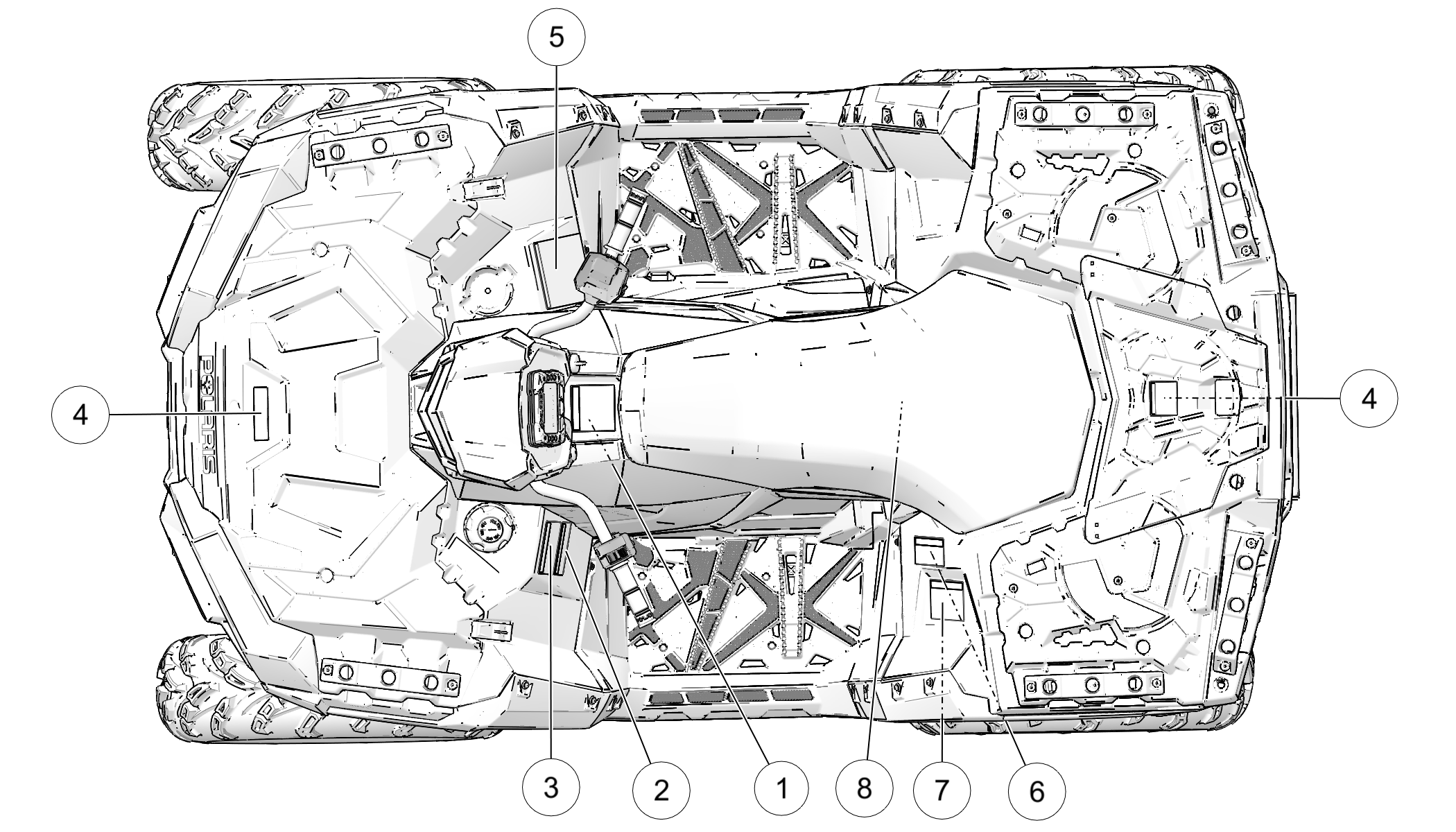 | 4 Advertencia de la rejilla/caja | 8 Advertencia del clutch (debajo del asiento) |