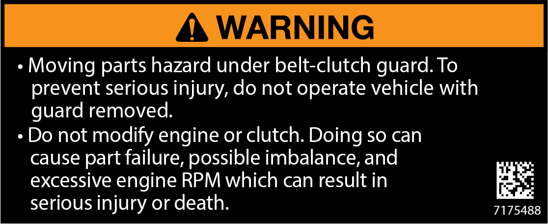 Do not modify engine or clutch. Doing so can cause part failure, possible imbalance, and excessive engine RPM which can result in serious injury or death.