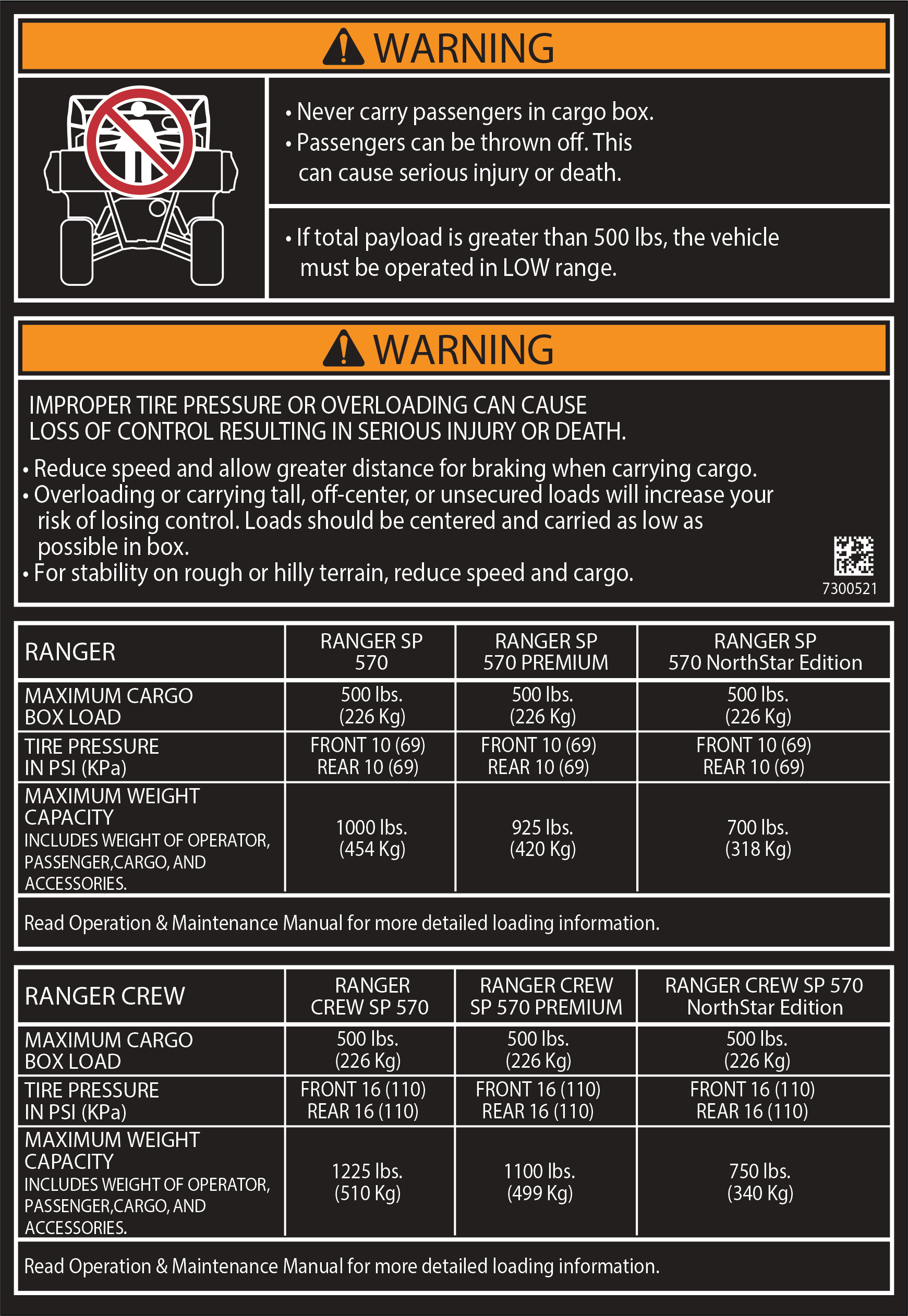 The Passenger/ Tire Pressure Warning is located on the cargo box.