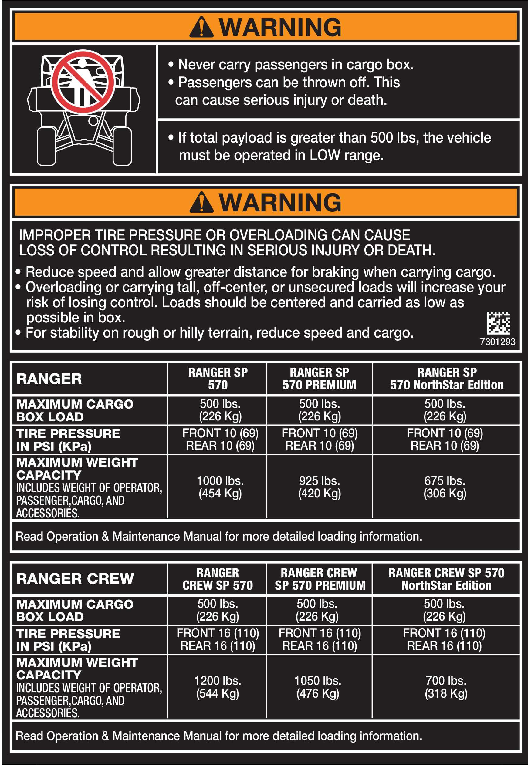 The Passenger/ Tire Pressure Warning is located on the cargo box.