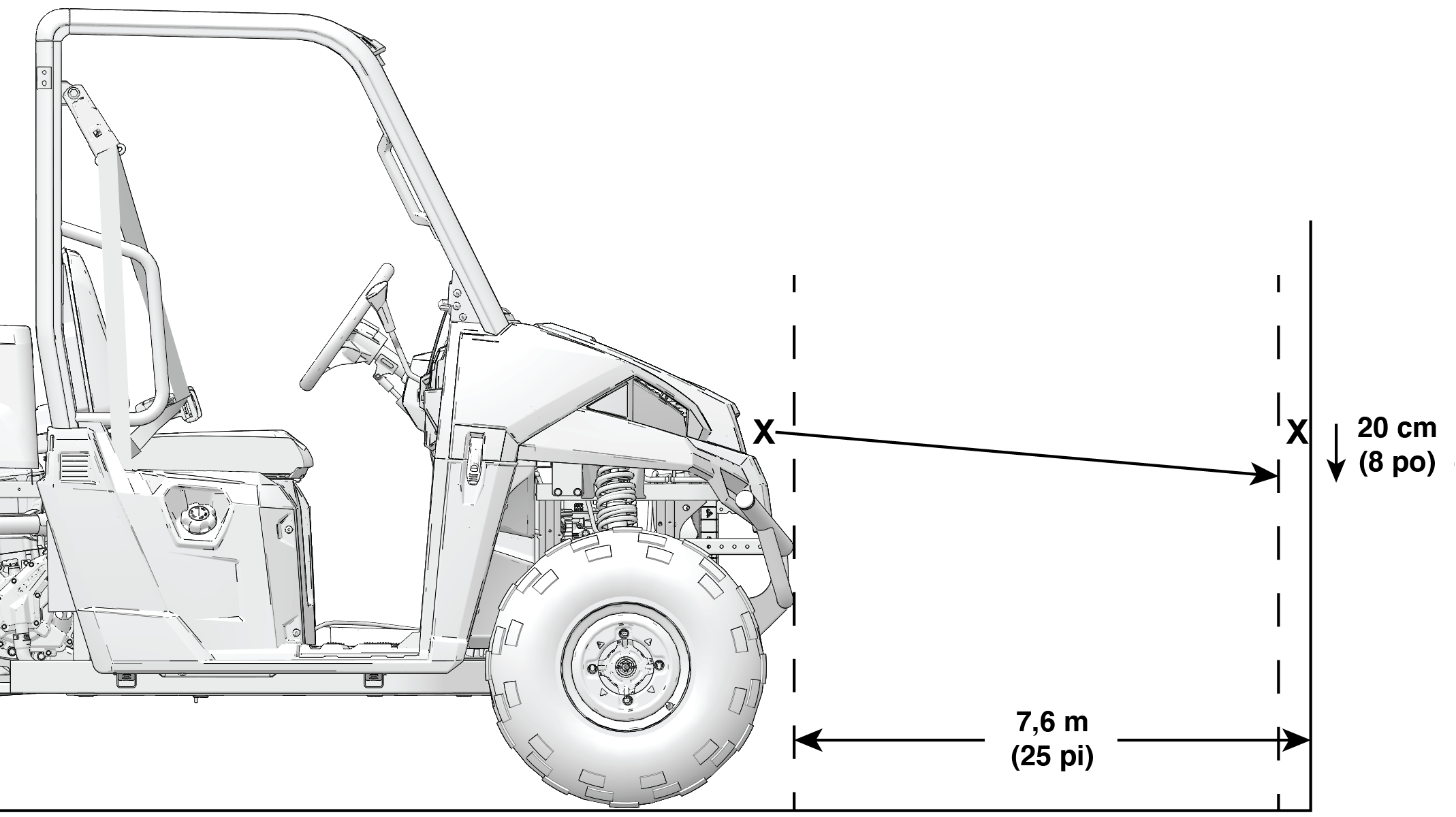 Noter la hauteur du phare. La partie la plus intense du faisceau de phare doit se trouver à 20 cm (8 po) en dessous du repère placé sur le mur. Le conducteur doit être assis sur le siège pendant cette étape.