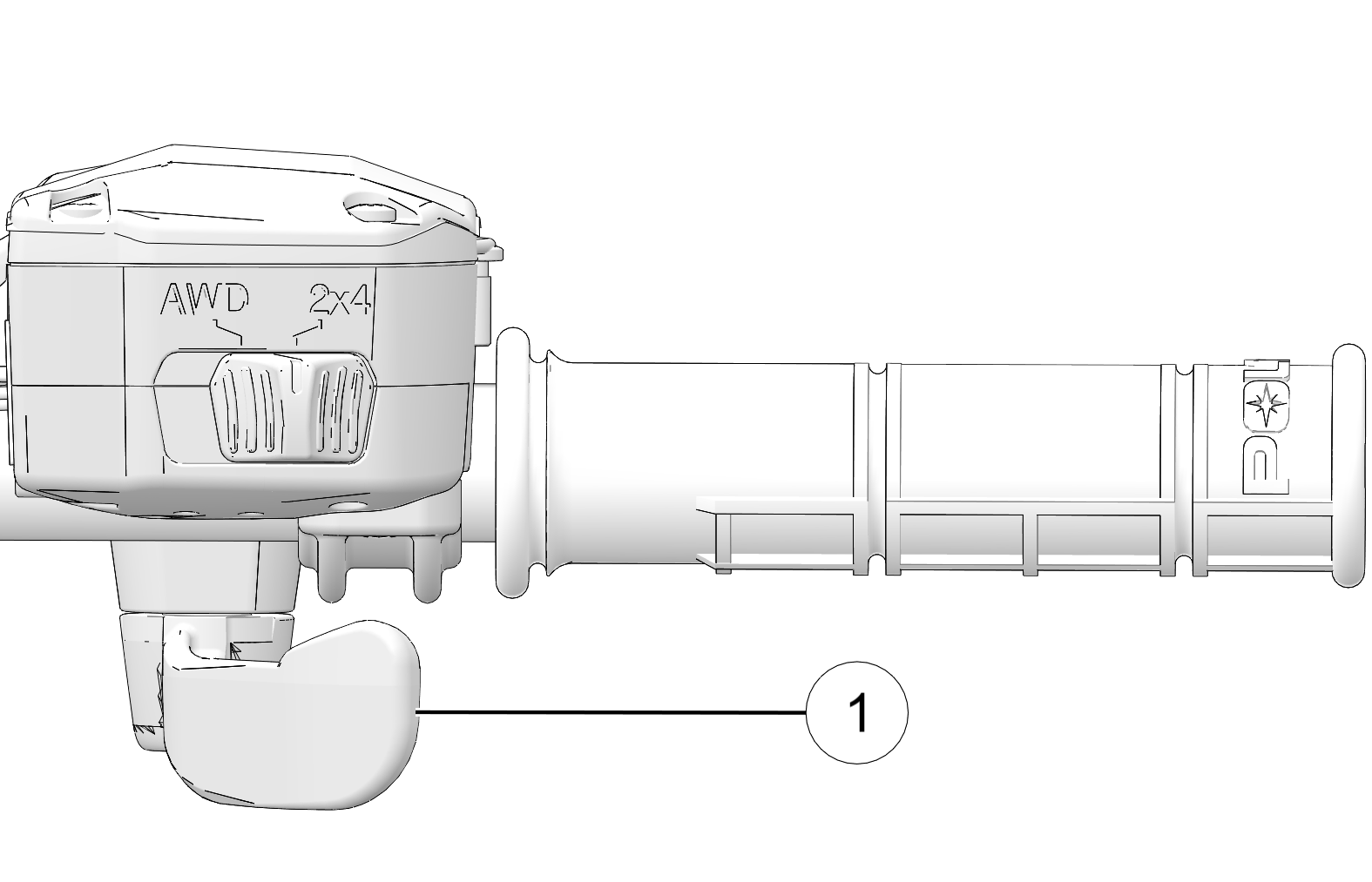 Engine speed and vehicle movement are controlled by pressing the throttle lever 1. The throttle lever is spring loaded. Engine speed returns to idle when the lever is released. This ATV is equipped with a throttle release switch, which is designed to reduce the risk of a frozen or stuck throttle.