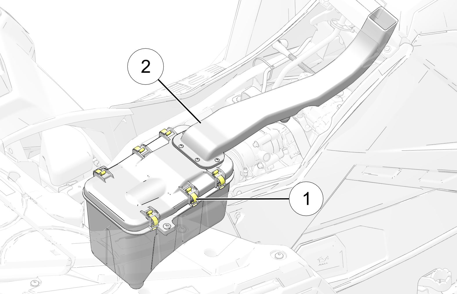 For ease of access to the spark plug cap, remove the six clips 1 from the air box cover and remove the cover 2.