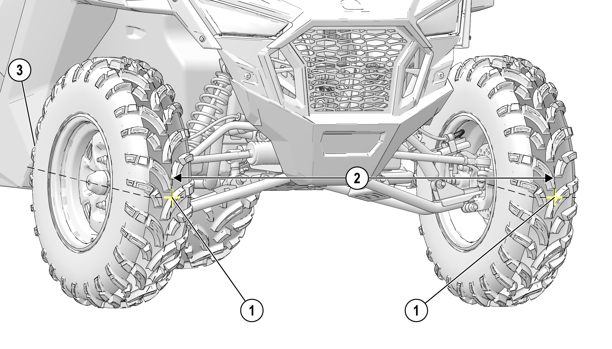 Nuevamente mida la distancia entre las marcas y anote la medida. Llame a esta medida “3”. Reste la medida “3” de la medida “2”. La diferencia entre las medidas “2” y “3” es la alineación de la convergencia del vehículo. La tolerancia de convergencia del vehículo recomendada es de 0 a 3.2 mm (0 a 1/8 pulg.) de divergencia. Esto significa que la medida en la parte delantera de la llanta 2 es de 0 a 3.2 mm (0 a 1/8 pulg.) más ancha que la medida en la parte trasera 3.