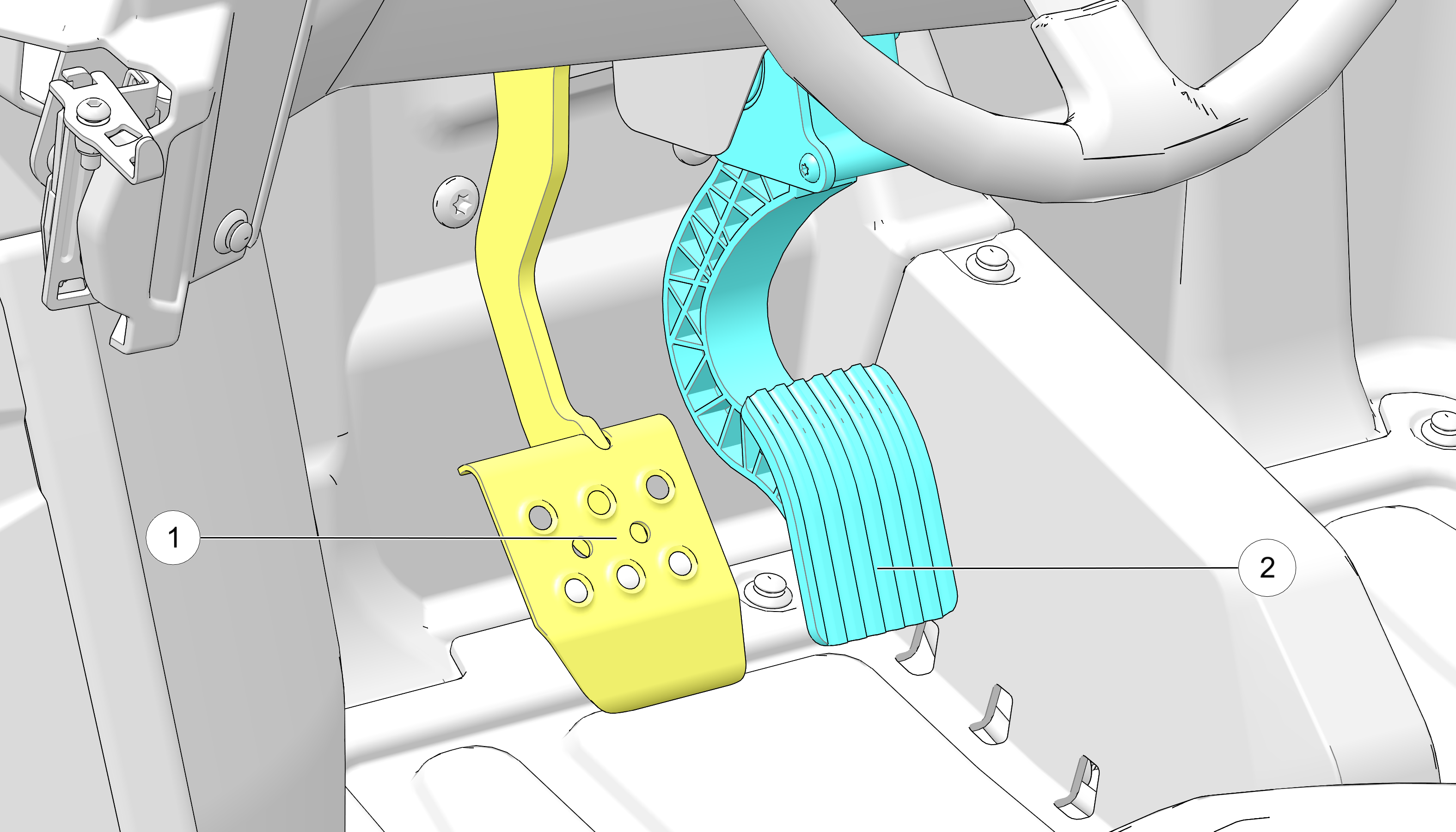 Presione el pedal del acelerador 2 para aumentar la velocidad del motor. Al soltarlo, la presión de resorte devuelve el pedal a la posición de descanso. Siempre asegúrese de que el pedal del acelerador regrese normalmente antes de arrancar el motor.