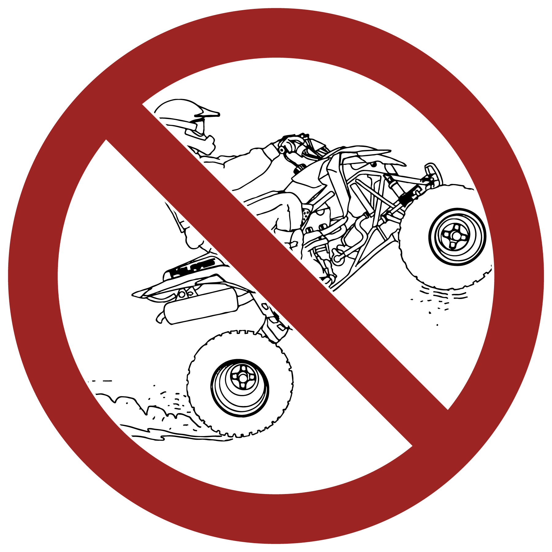 Attempting wheelies, jumps and other stunts increases the risk of an accident or overturn. Never attempt wheelies, jumps, or other stunts. Avoid exhibition driving.
