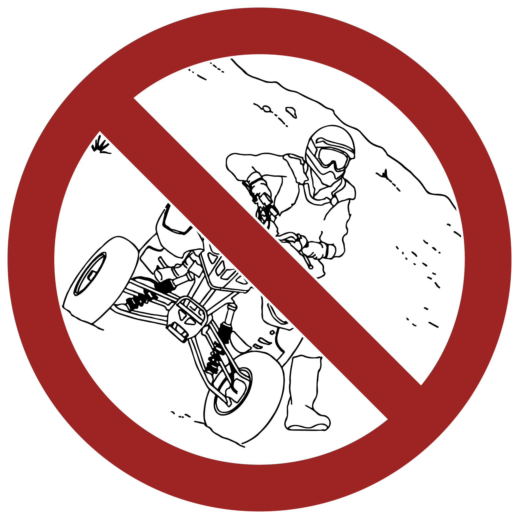 Driving on a sidehill is not recommended. Improper procedure could cause loss of control or overturn. Avoid crossing the side of any hill unless absolutely necessary. If crossing a hillside is unavoidable, always follow proper procedures as described in the owner’s manual. See Driving on a Sidehill (Sidehilling). Never attempt to turn the ATV around on any hill until you’ve mastered the turning technique (on level ground) as described in the owner’s manual. See the Turning Around on a Hill section for details.
