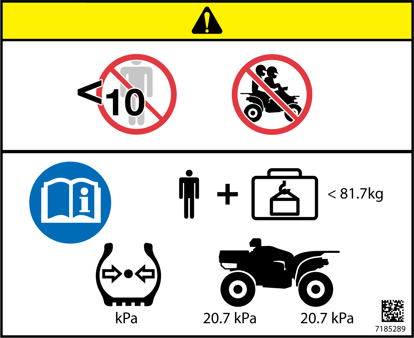Read your owner’s manual. Operation of this ATV by children under age 10 increases the risk of severe injury or death. Adult supervision required for children under age 16. NEVER permit children under age 10 to operate this ATV. NEVER ride as a passenger. Passengers can cause a loss of control, resulting in SEVERE INJURY or DEATH. Improper tire pressure or overloading can cause loss of control. Loss of control can result in severe injury or death.