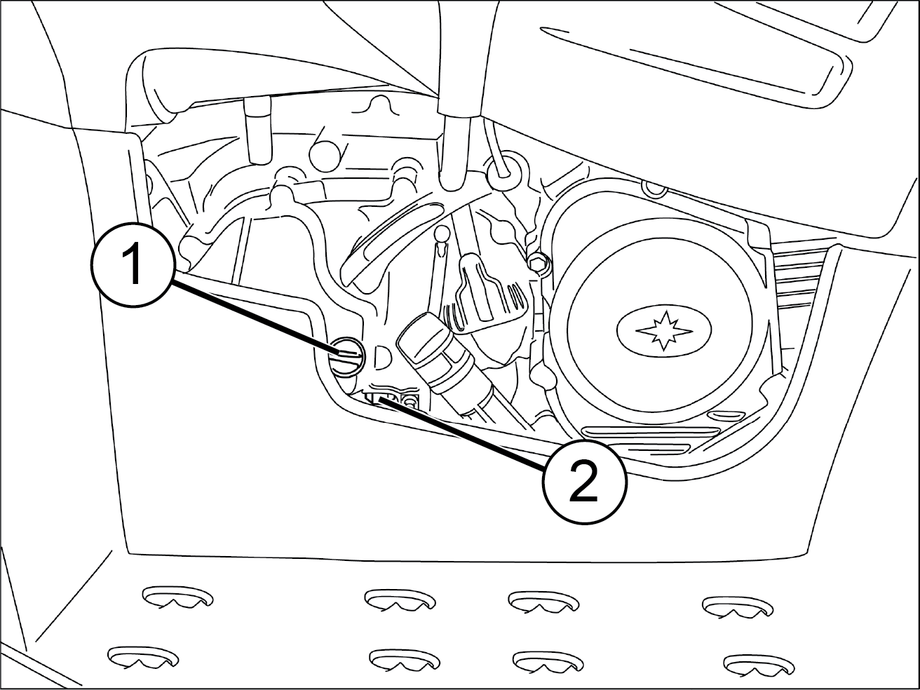 The fill plug 1 is located on the rear of the gearcase. The drain plug 2 is located on the bottom of the gearcase. Access the fill plug through the left rear wheel well. Maintain the fluid level at the bottom of the fill plug hole threads.