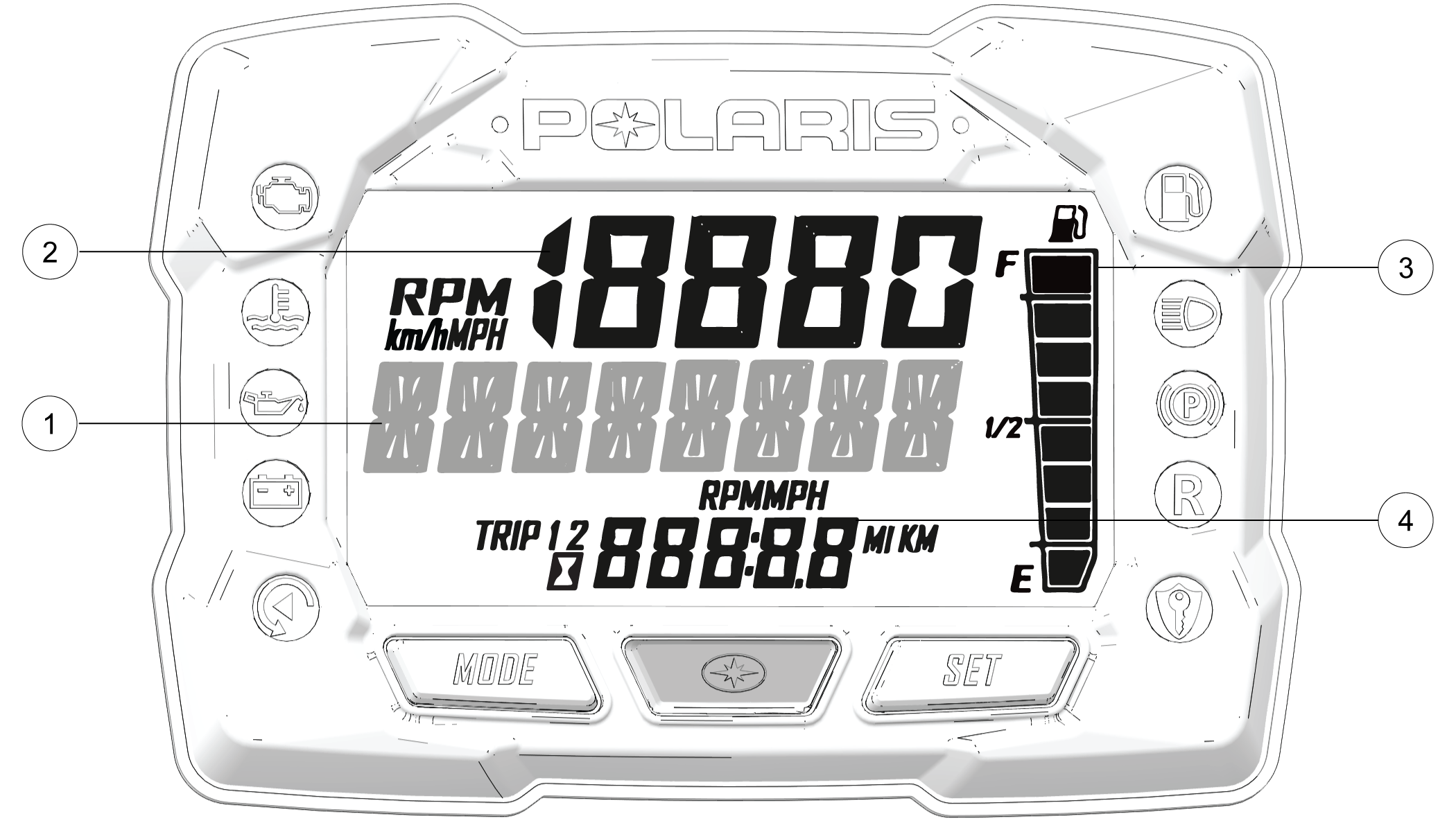 4 Odometer/Engine Hour Display - This area displays the odometer, Trip A, Trip B and engine hours.