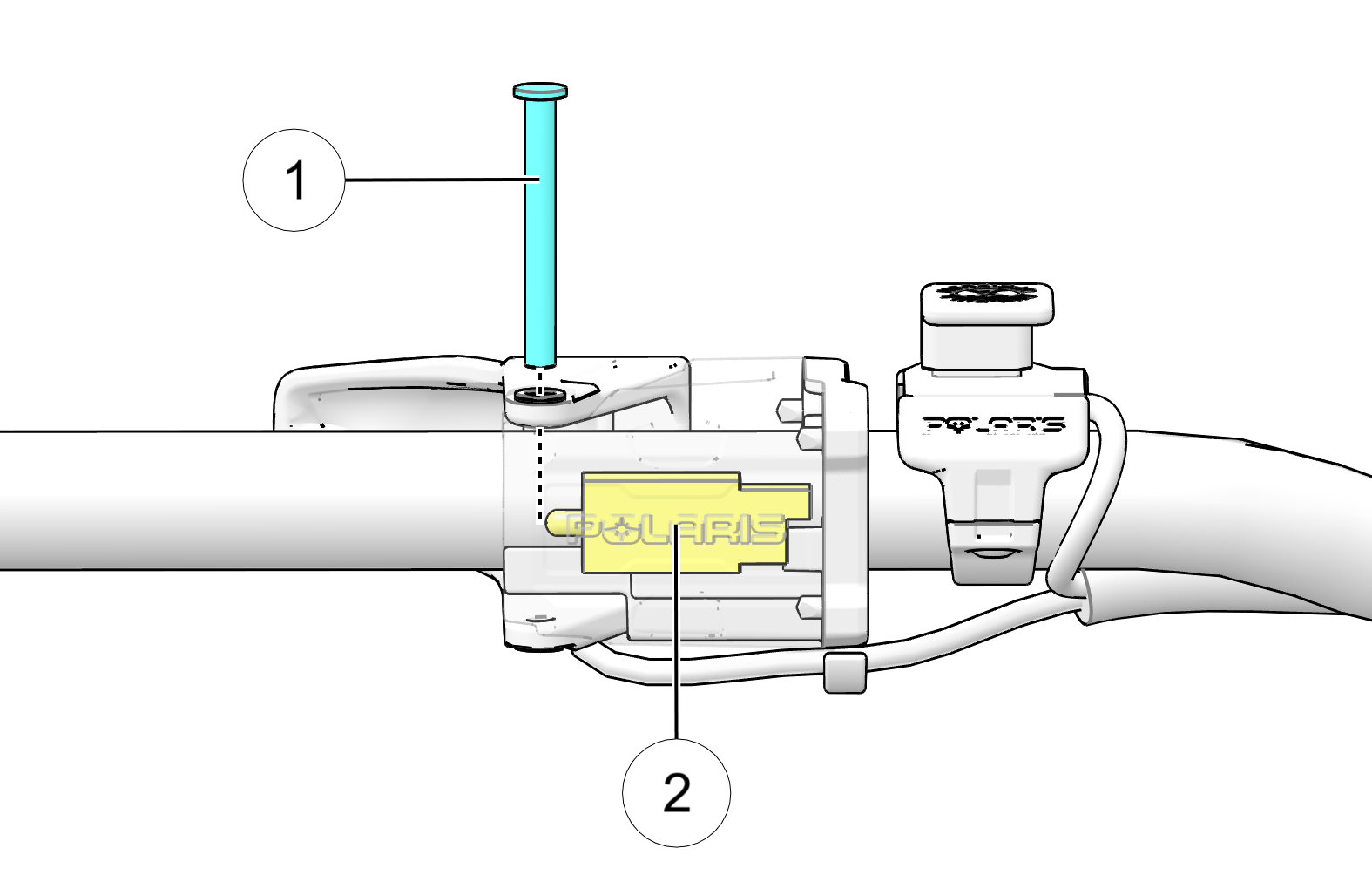 When working properly, the throttle safety switch is designed to stop the engine whenever all pressure is removed from the throttle lever and the throttle cable or valves do not return to the normal closed position. The throttle lever pin 1 releases pressure to the safety switch 2 and stops the engine.
