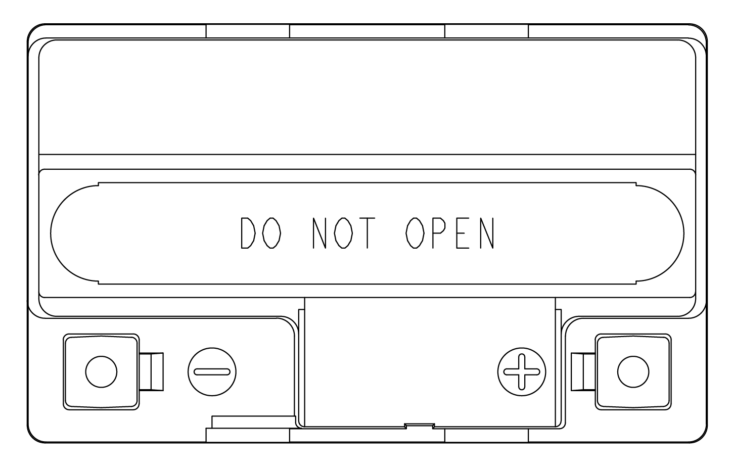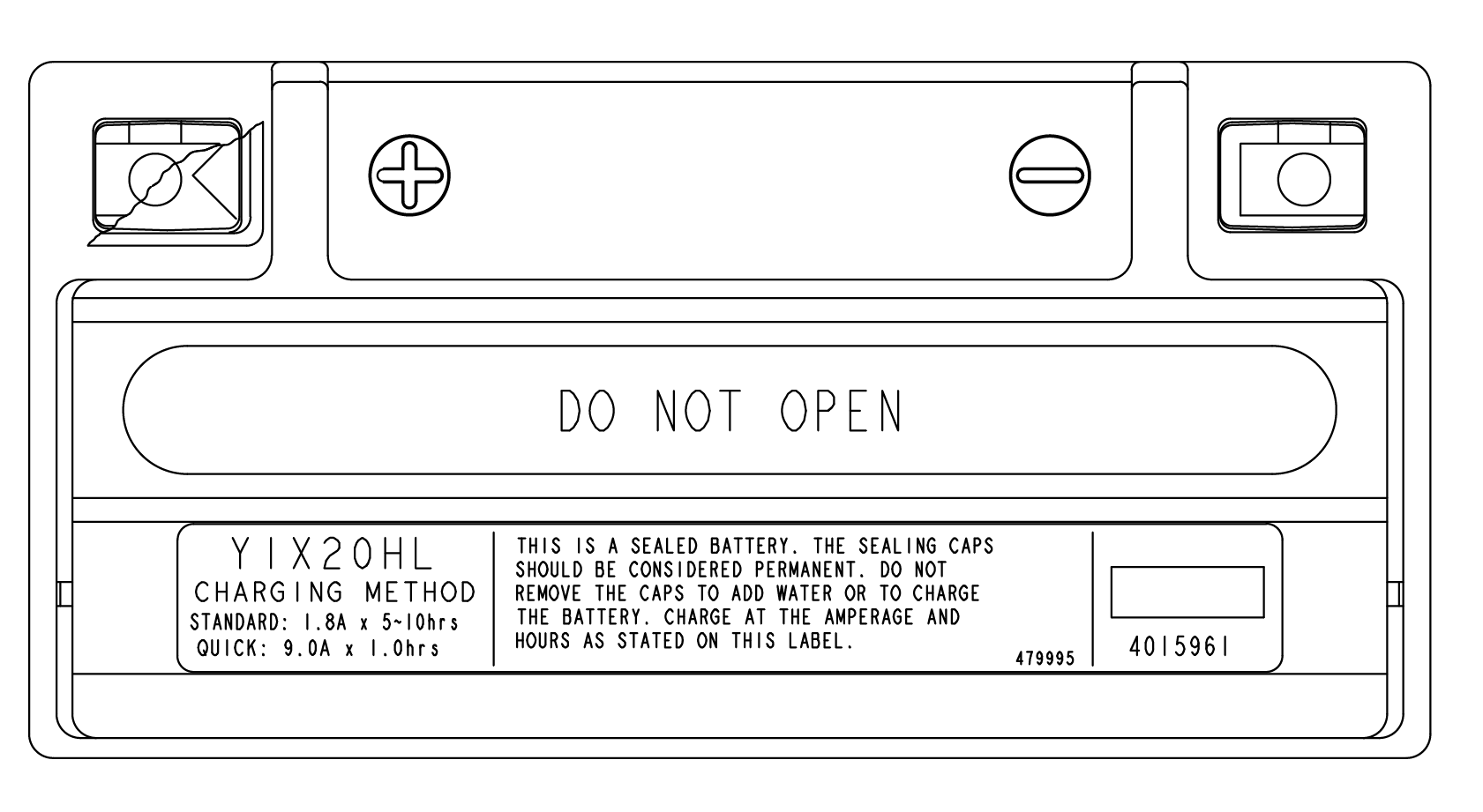 Removable cap plugs and strip are found top-side of the battery
