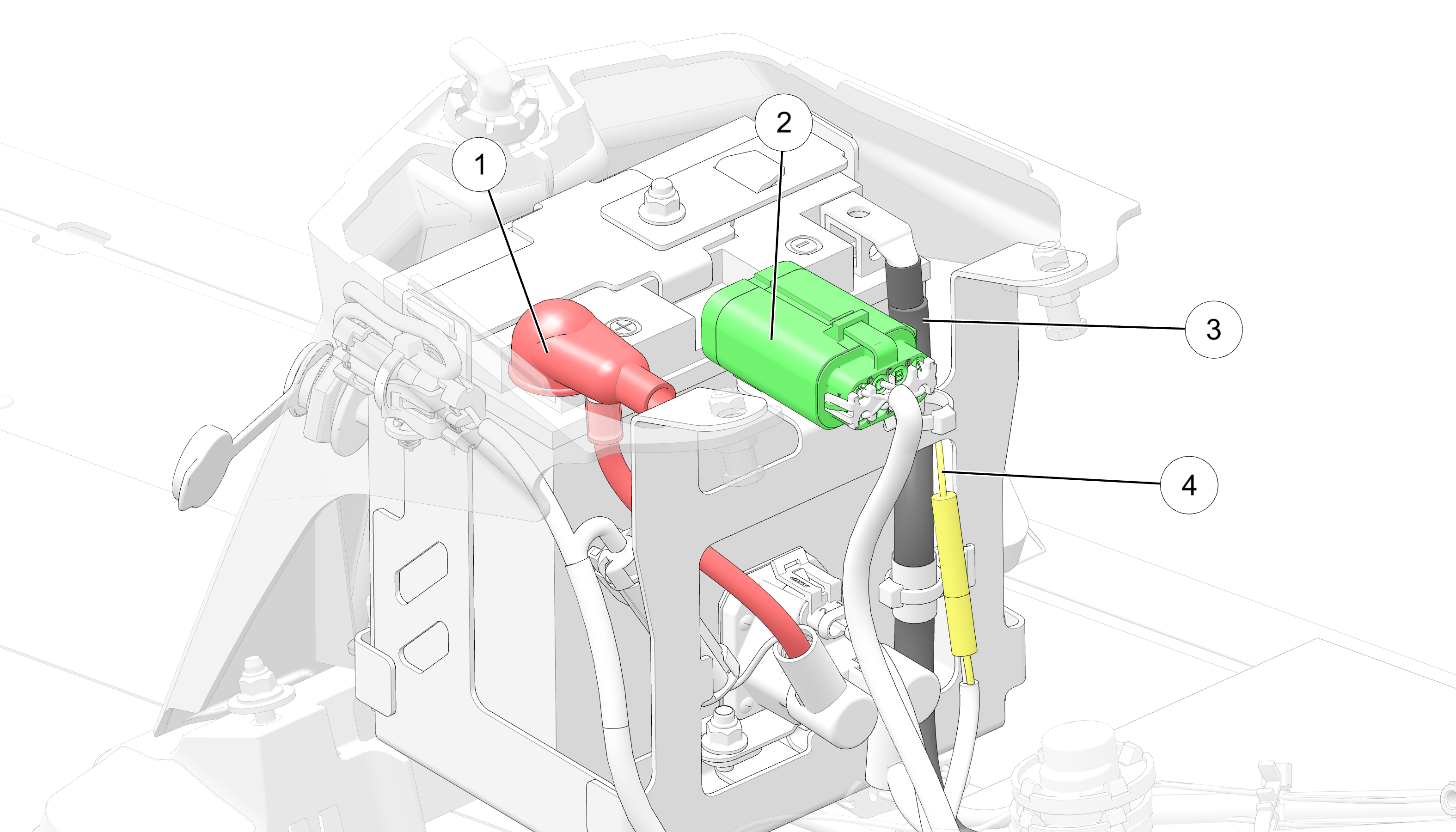 Route the BROWN harness ground wires 4 and BLACK main battery ground cable 3 as shown in the image. Both are routed up and over the rubber strap. If the ground wires/cable are routed down the side of the battery, they may interfere with the rear side panel tab. Note the routing of the RED (positive) battery cable 1 and that the right fender is pulled away from the chassis. Item 2 is the constant power fuse connector.