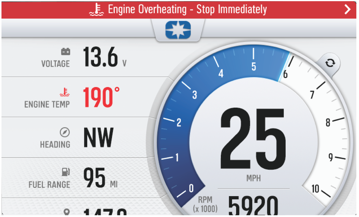 If the engine goes over temperature, a red banner will appear at the top of your display stating: ENGINE OVERHEATING – STOP IMMEDIATELY.