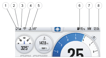 The Icon Bar is located across the top of the touchscreen and displays cell phone, headset, and wireless internet connectivity, fuel level, compass heading and local time.