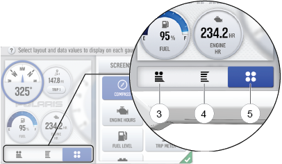 The display allows up to four customized gauge screens. All but one screen can be deleted; one will always remain as the default.