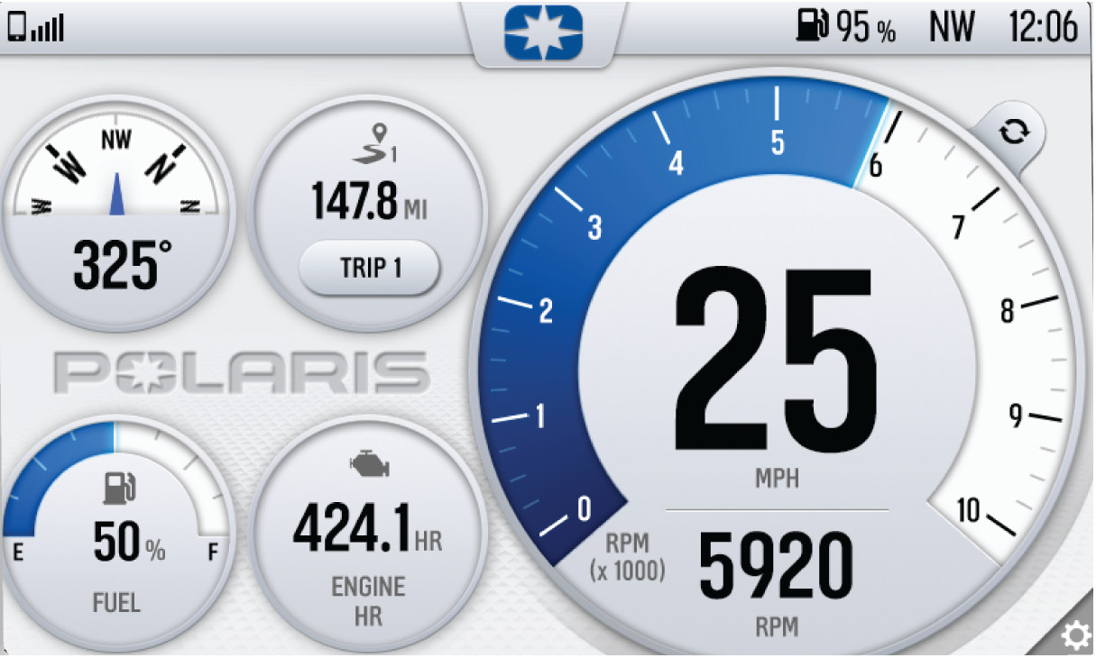 The Gauge Screen is the screen that will appear upon vehicle start-up and displays a customizable view of vehicle information including speed, RPM, fuel level, engine temperature, engine hours, trip meter, battery voltage, and compass.