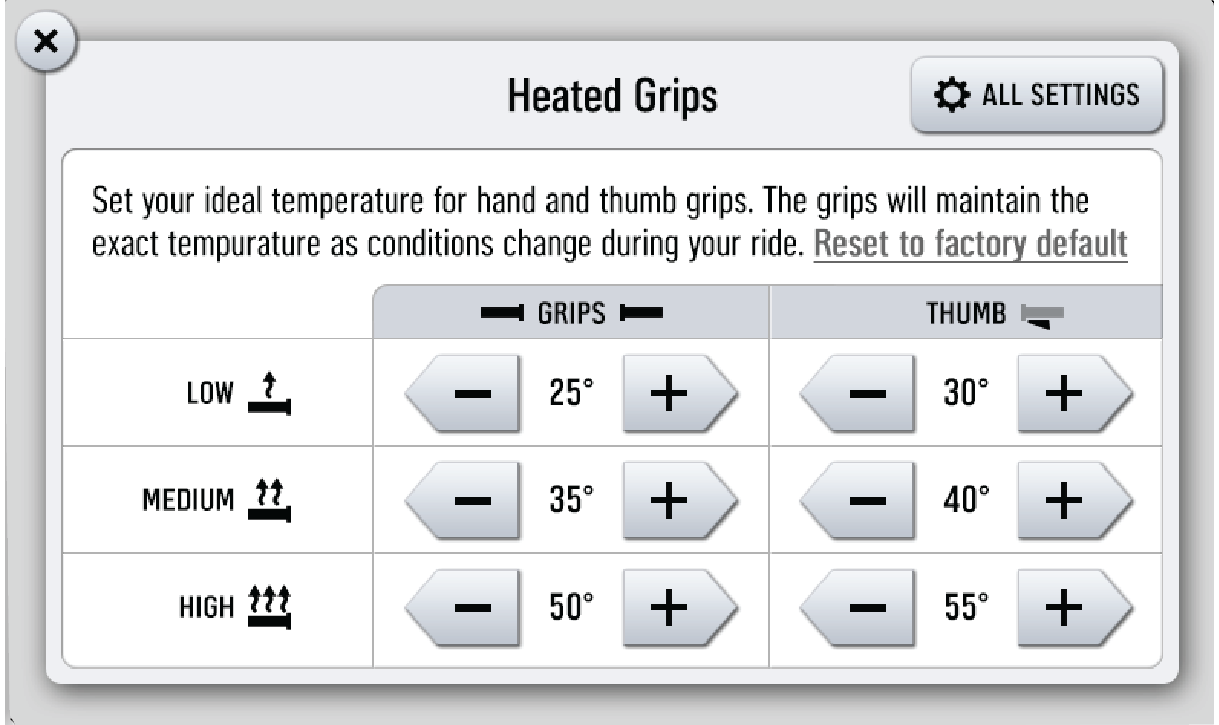 Heated Grips Settings | Opens the SmartWarmer settings to customize the temperature of each heat level. |