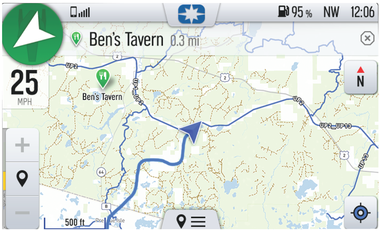 Press the Map button from the App Tray in the Badge Panel or press the Back button to cycle to the map screen. The map will center you based on the location of the in-vehicle GPS.