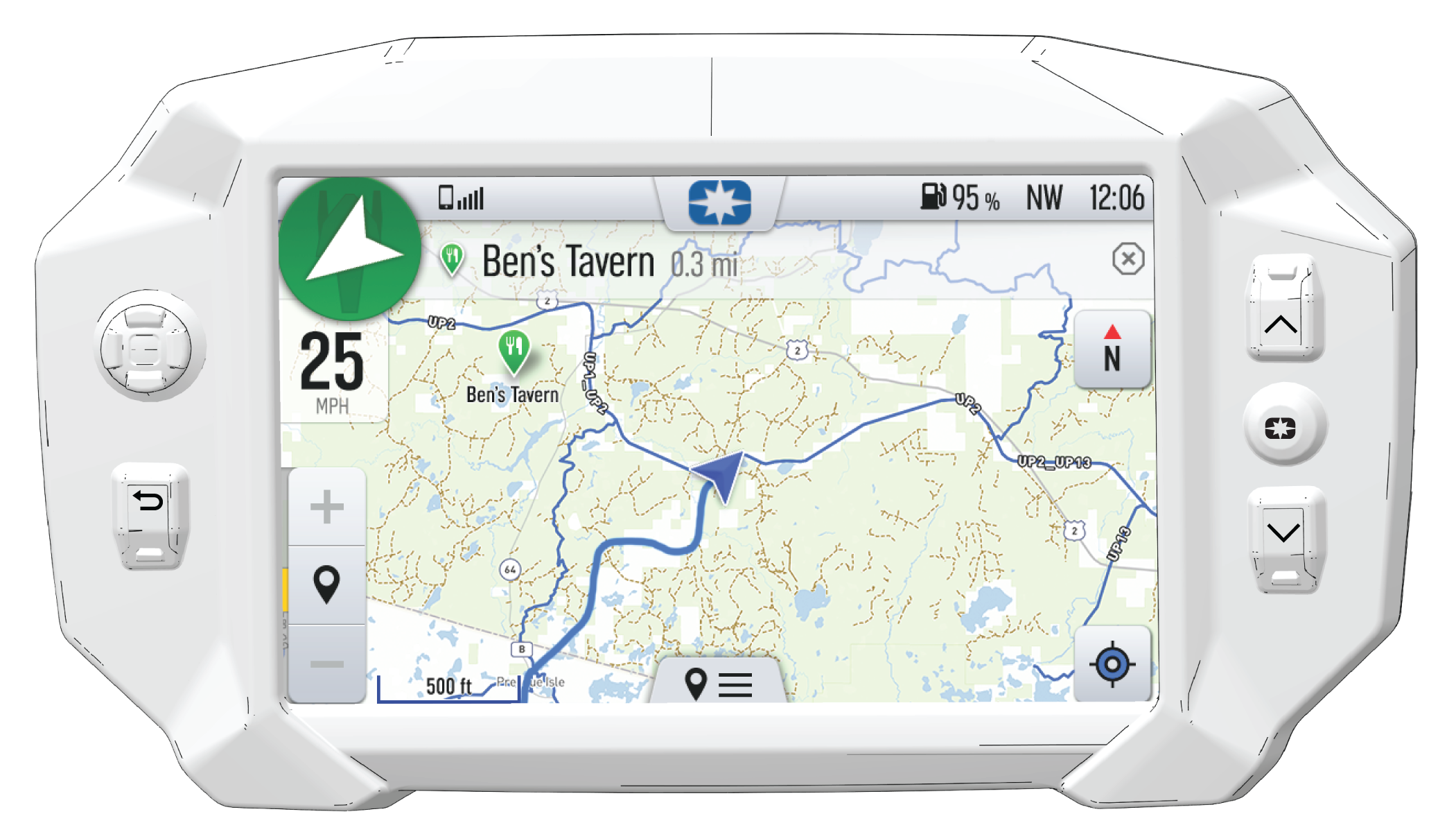 Press the Map button from the App Tray in the Badge Panel or press the Back button to cycle to the map screen. The map will center you based on the location of the in-vehicle GPS.