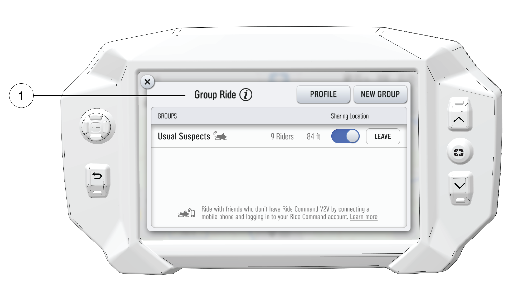 For information on how Group Ride works and for instructions on how to set up Group Ride using your smartphone, or with a vehicle-to-vehicle (V2V) antenna, tap the “i” icon beside the title from the Group Ride Panel 1.