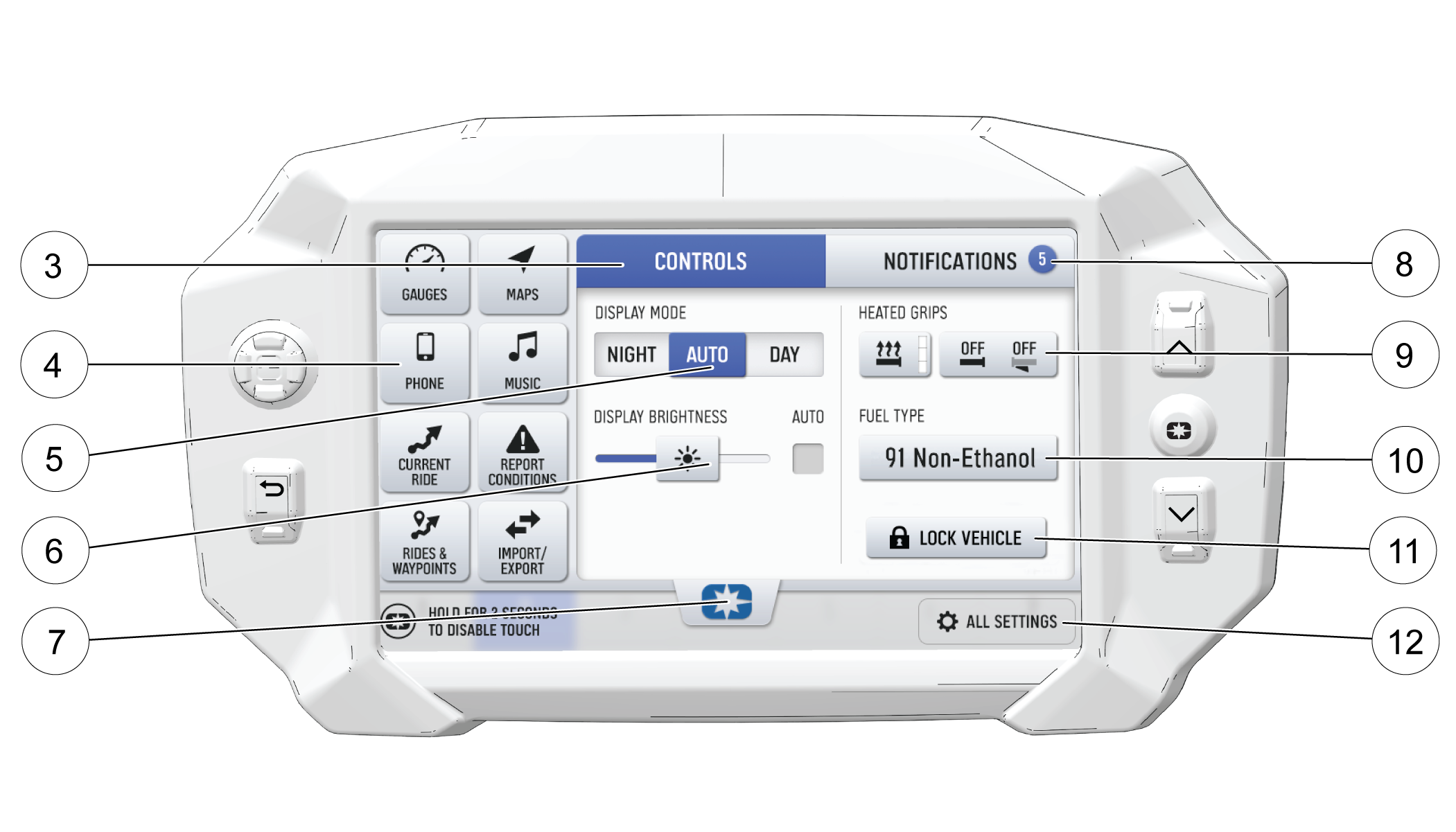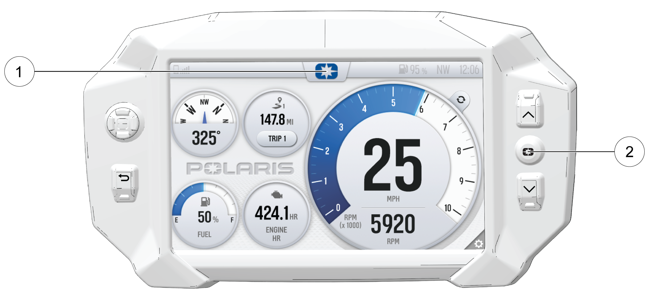 There are two ways to open the Badge Panel, press the Polaris icon 1 at the top of the touchscreen or the Polaris Button 2 on the right side of the display.