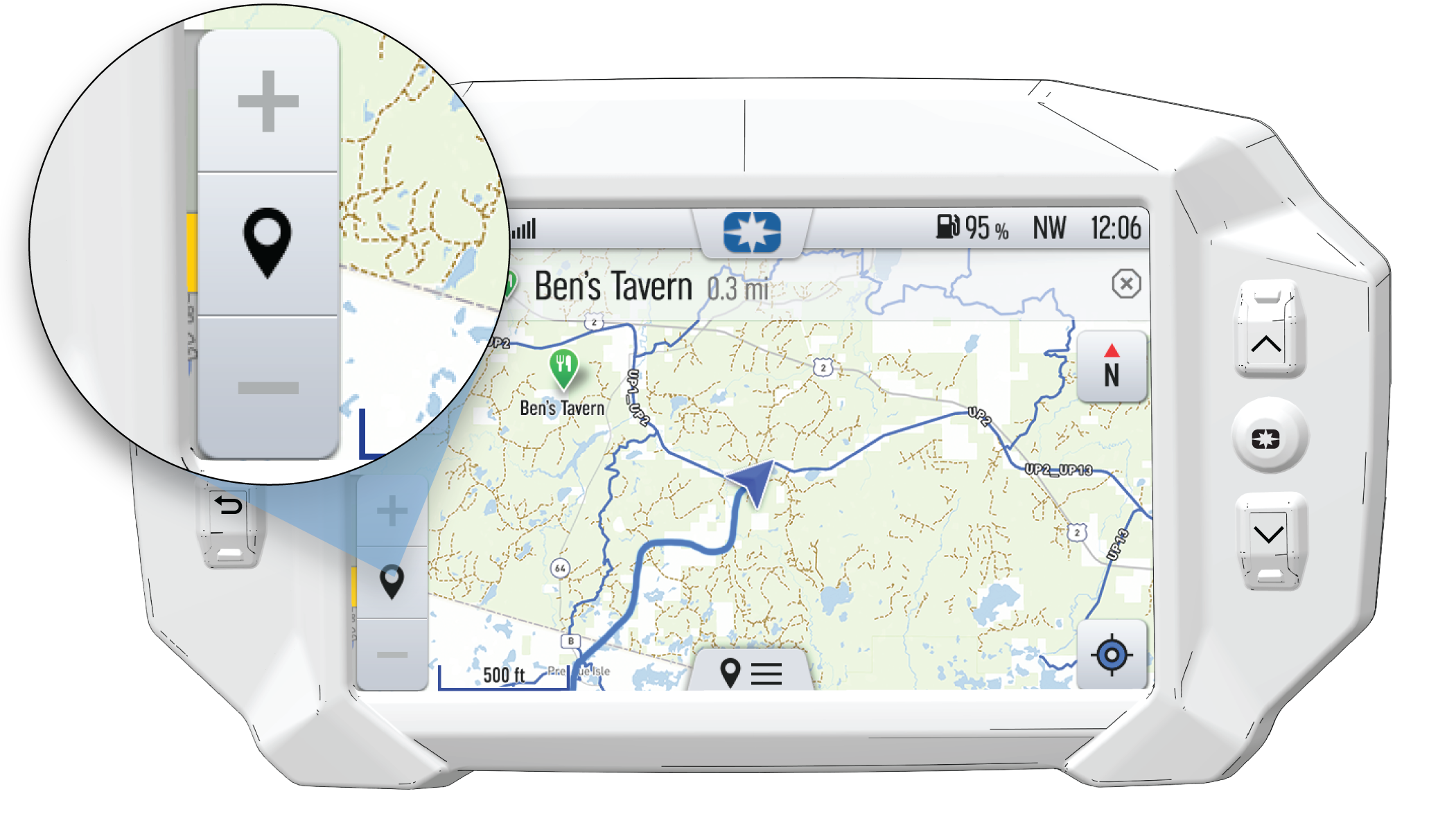 The waypoint icon appears when navigation is in use and the GPS is routed to a specific waypoint. Press the waypoint icon to focus on the destination point. To set the focus back to your location, press the target icon in the bottom right corner of the screen.