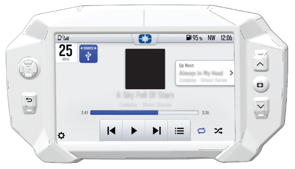 Audio playback through USB or Bluetooth® devices are compatible with your Ride Command display. The Music Screen allows you to access music stored on your smartphone or other music device. You can pair your device using Bluetooth®, or by connecting it to the display’s USB port.
