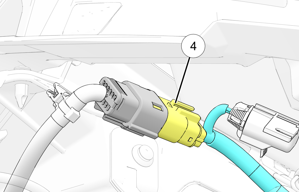 Install the hood, and then connect the hood harness connector 4 to the main harness.