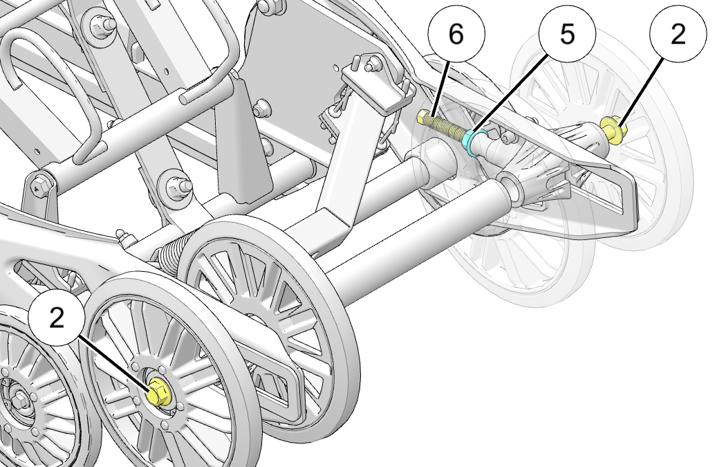 If the track runs to the right: Loosen both idler shaft bolts 2 and the right jam nut 5, and then tighten the right track adjuster bolt 6.