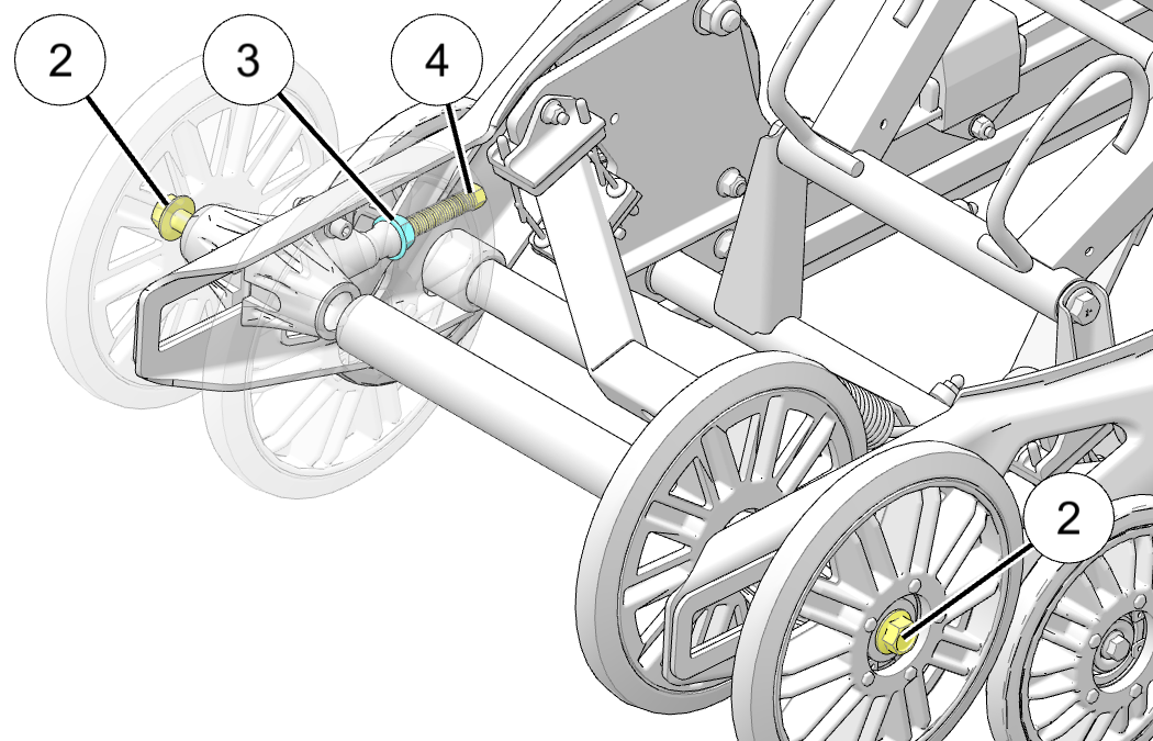 If the track runs to the left: Loosen both idler shaft bolts 2 and the left jam nut 3, and then tighten the left track adjuster bolt 4.