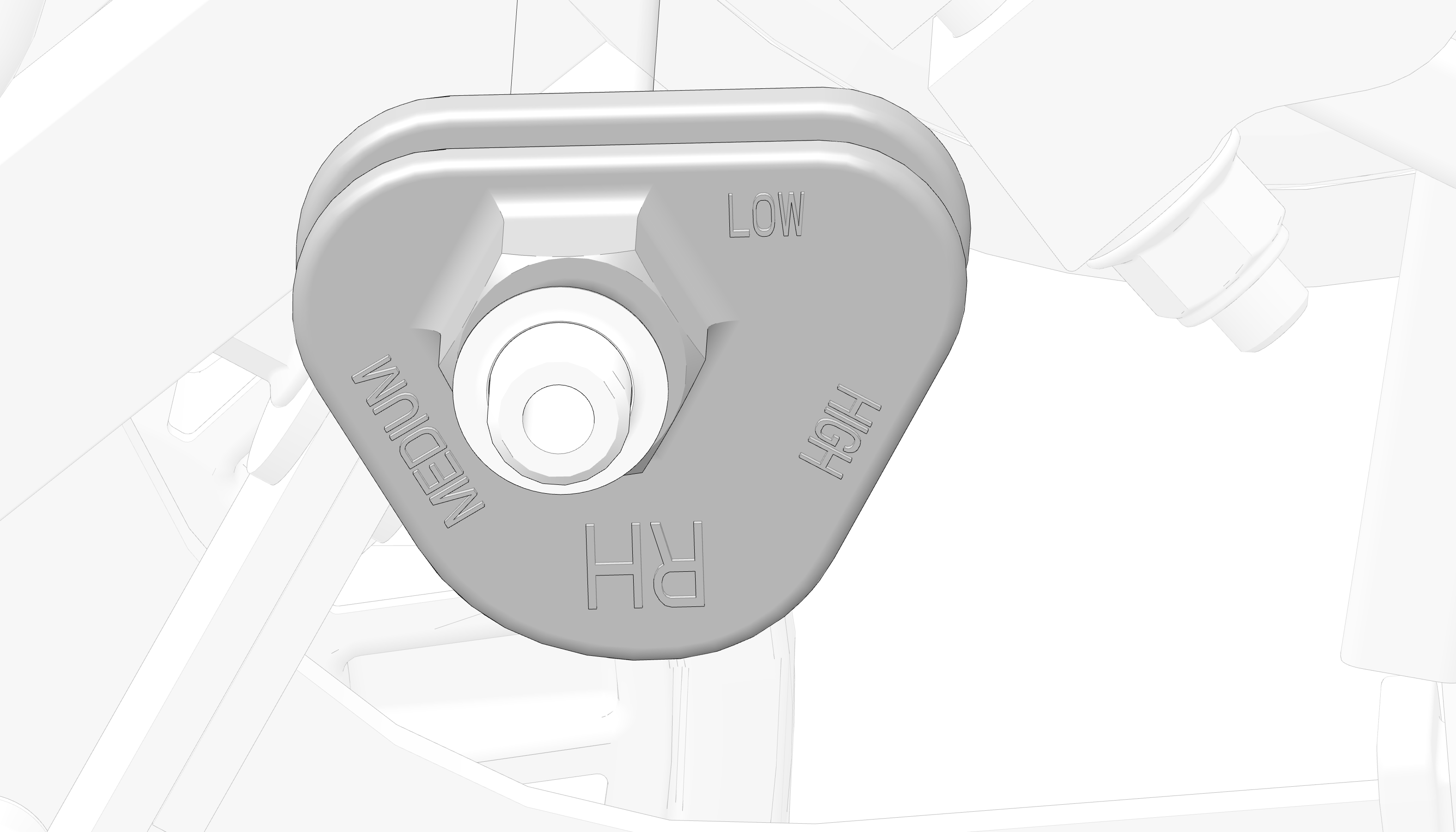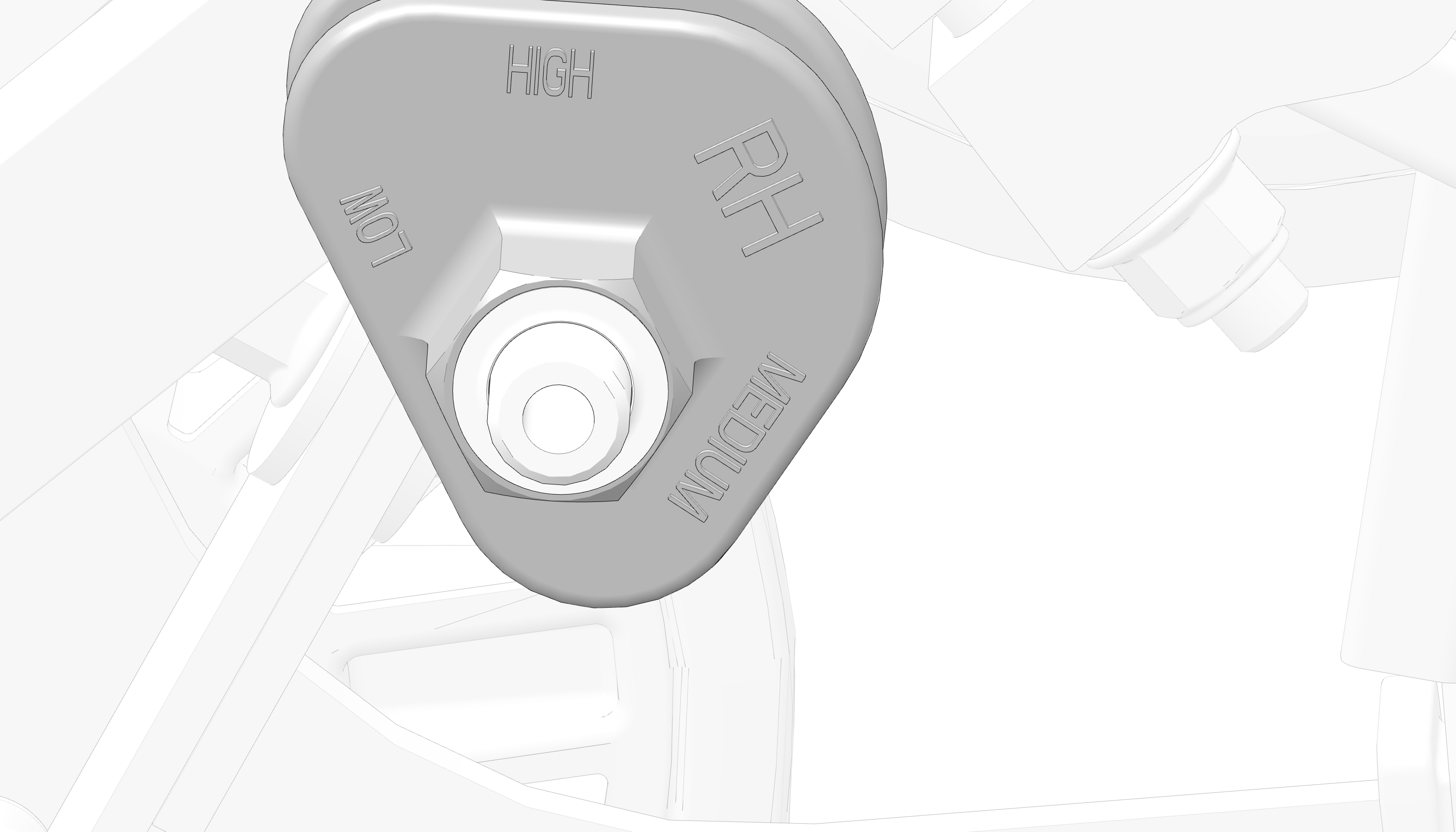 To adjust rear torsion spring preload, rotate the three-position cam using the engine spark plug tool. Adjustment is easiest when the cam is rotated from low to medium, and then to high. Rotating directly from low to high will require significantly more effort. Different rate torsion springs are available if a firmer ride is desired. See your authorized POLARIS dealer for more information.