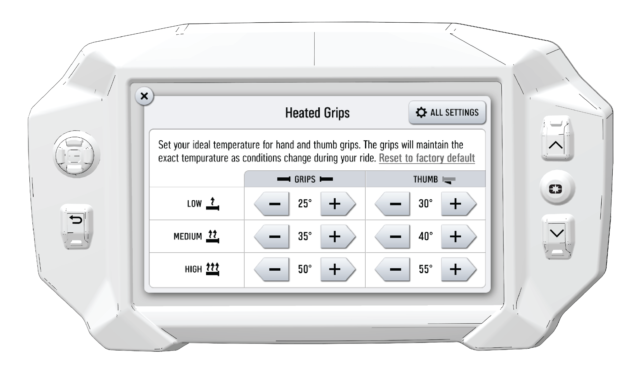 Heated Grips Settings | Opens SmartWarmers settings to customize the temperature of each heat level. |